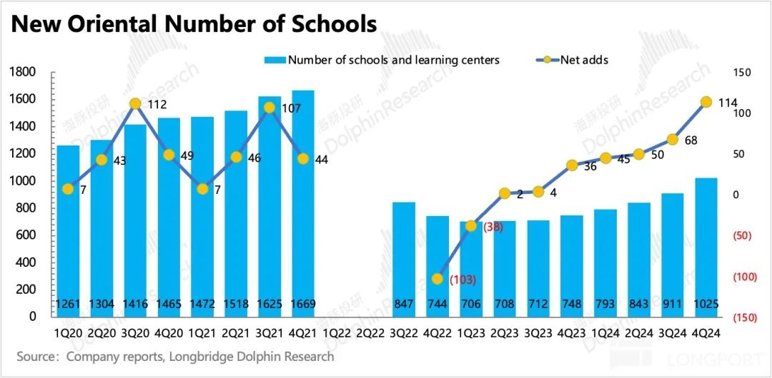 实际上,除了每季度跟踪管理层的指导外,海豚君对新东方的定性判断是,新东方作为双减制后一直谨慎扩张的新东方,开始加速扩张,说明沉浸在行业多年的教育老鸟,对行业和公司本身的信心都在增强,这反映了当前高需求的可持续性。