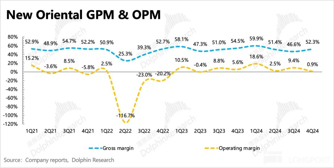 但 Q4 新东方的收益表现仅在预期之内,引导也没有惊喜。取而代之的是利润率再次超出预期下降,Non-GAAP 经营利润率 低于市场预测和管理指导的3.2% 6%。