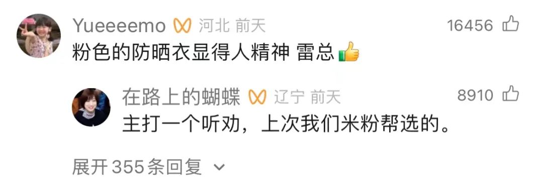 比方说雷军会让网友帮忙参谋参谋,自己到底适合什么颜色的防晒衣。