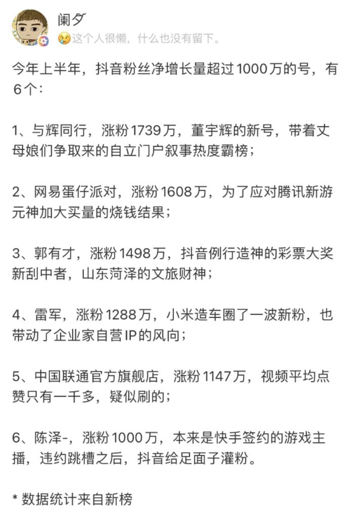 上半年,雷军是唯一一个在抖音上增长超过1000万粉丝的数字。只有郭有才与辉同行、蛋仔派对、常规押运抖音流量奖券。