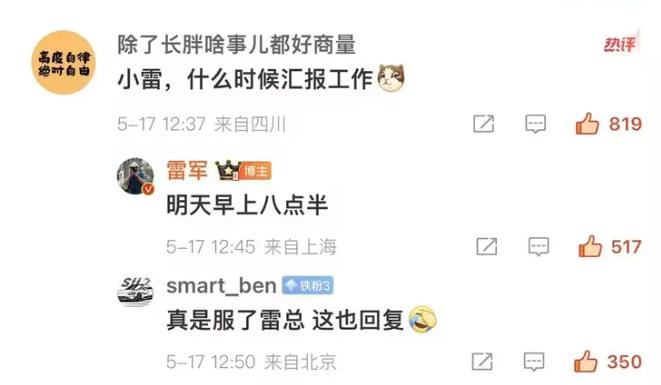 类似这类网友调侃自己又是“军儿”,又是“小雷”的玩梗行为,雷军从不生气,也真的可以放下架子,接住梗玩得开心。
