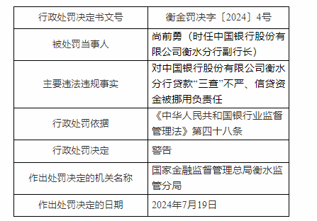 目前,中国银行衡水分行副行长尚前勇、营业部主管高仑、李国栋、普惠部主管李凡庄被警告。