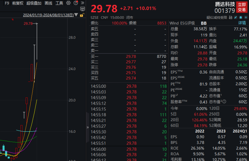 腾达科技再次收盘涨停,收盘29.78元/股,股价创上市以来新高。到目前为止,该股已经连续9个交易日上涨,累计上涨约136%。