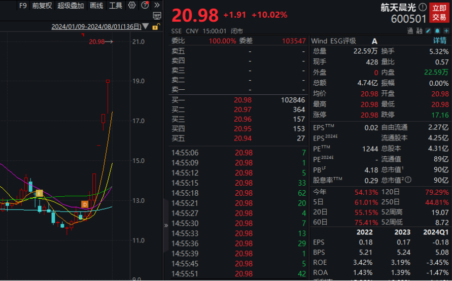 太空晨光已经连续5个交易日涨停。昨晚公司发布风险警示称,公司主营业务涉及智能制造、核工设备、物流保障、柔性管件、环保设备、压力容器等。产品主要用于石化、水利水电、核电、环卫、能源设备等领域。公司在商业航天领域的应用产品主要是金属软管,用于保证发射任务。2023年,这部分收入约2700万元,收入占比相对较小。短期内,公司的收入结构不会发生重大变化。