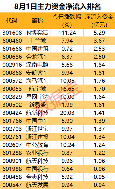 新股N博实结主力资金净流入额度居首,达到5.29亿元。这只股票今天上涨了111.24%,盘中一度上涨了140%以上,全天成交额为12.78亿元,换手率为81.81%,总市值为83.65亿元。公开资料显示,N博实结是一家专业从事R&D设计、生产和销售物联网智能硬件产品的高科技企业,是一家专业从事特新“小巨人”的公司。它以通信、定位、AI等技术应用为核心,基于自主开发的无线通信模块,为物联网的许多应用领域提供智能终端产品和配套解决方案。