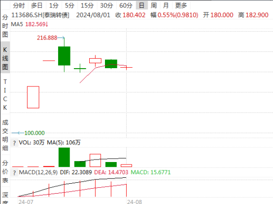 在泰瑞可转债上市后,赛龙可转债的表现非常相似。八月一日,赛龙可转债继续在高位波动,收盘价为184.778元,转股溢价高达96.47%。