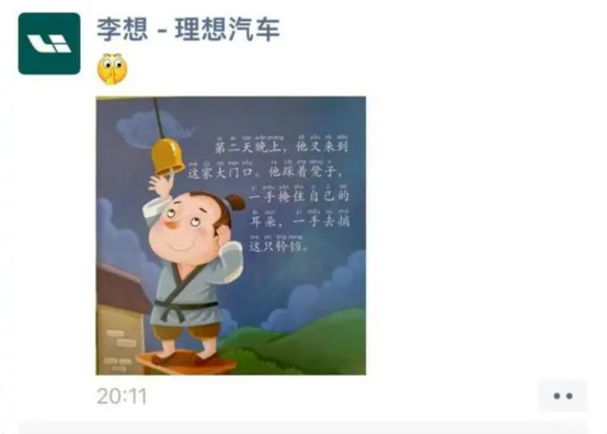 对于很多汽车公司高管的言论,李想在朋友圈分享了一个关于偷铃寓言的插图,并附上了一个“嘘”的表情包,疑似回应汽车公司联合抵制理想周榜事件。