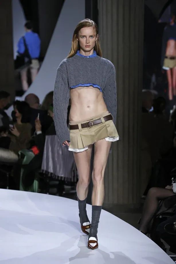 在Miu Miu 在2022春夏大秀中,模特们穿着蓝色工装衬衫,搭配低腰迷你超短裙,或者穿着超短毛衣,不仅仅是Miu Miu的形象已经从一个甜美的女孩变成了一个叛逆的辣妹,大规模露脐的搭配也被定义为“稀里糊涂的搭配”,在社交平台上疯狂霸凌。