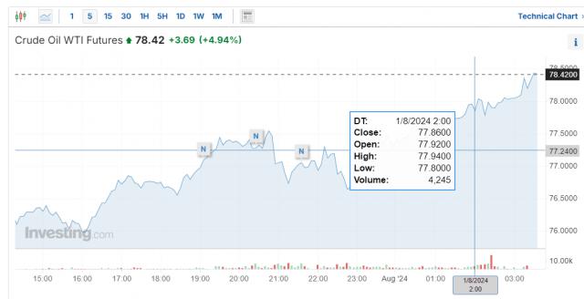 受伊朗方面的消息影响,鲍威尔在演讲期间,WTI 日内石油涨幅达到 5%,报 78.48 美金 / 水桶。黄金、美债、日元、瑞郎等避险资产上涨,美国股市上涨。