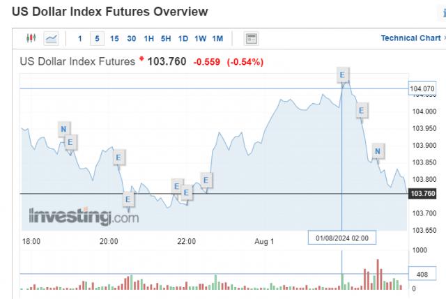 ICE 美元指数跌 0.28%,报 104.266 离开北京时间星期三晚上。 22:00 刷新的日低 103.926 点。彭博美元指数下跌超过指数 0.4%。
