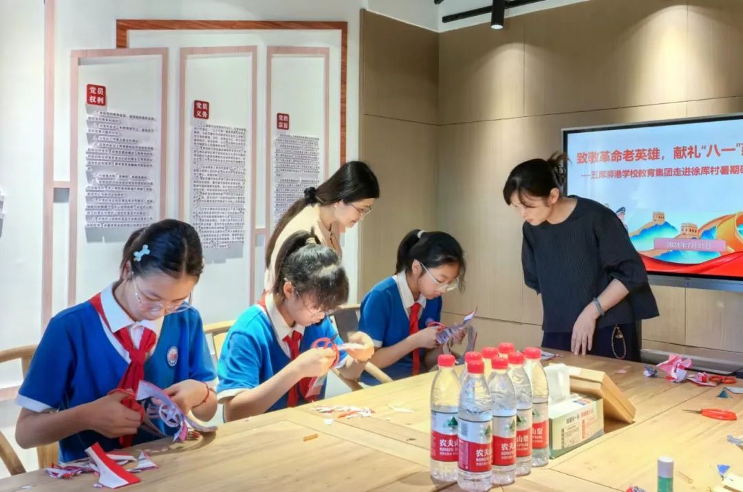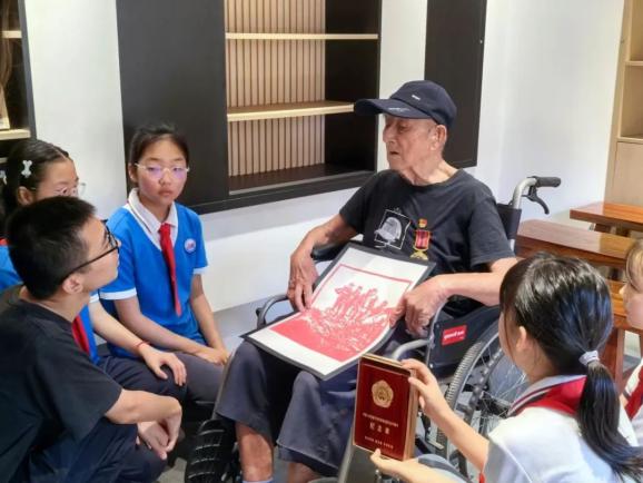 同一天,活动组织者还邀请了港镇南山村剪纸团队的老师进村指导,带领孩子们制作“八一”主题剪纸,制作精美的书签。徐雪明,一名92岁的抗美援朝老兵,也受邀前往。一看见老人家,孩子们便围起身来,询问当初参战的情况,还送上他们剪下的精美剪纸作品。钱雨涵学生说:“今天的美好生活离不开革命前辈们的努力。我们在感谢他们的同时,也要努力学习,成长为祖国的建设做出贡献。”