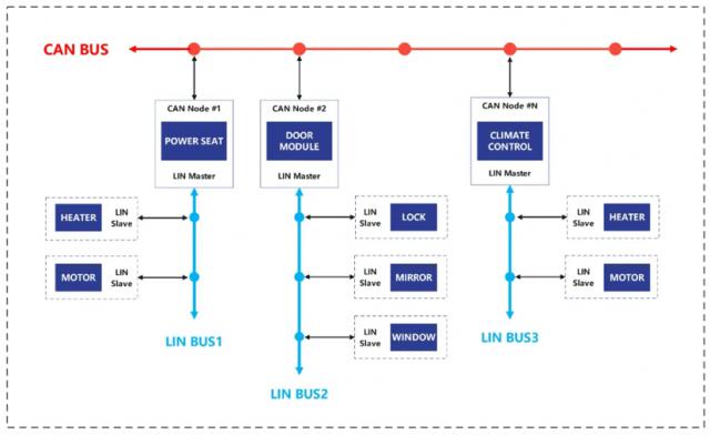 执行装置、传感器或开关、 ECU 建立基本的串行网络,LIN(局部互联网)总线大大降低了汽车制造商的设计成本,LIN 灯光、车门窗、电动座椅、空调、传感器等都是汽车上的典型应用。