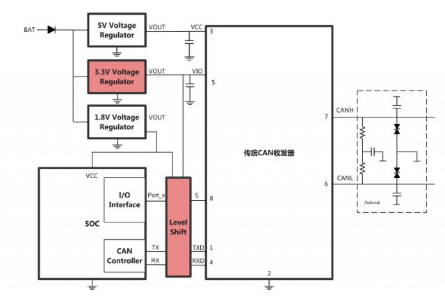 ( a ) 传统 CAN 收发器和 1.8V SOC 的通讯方案