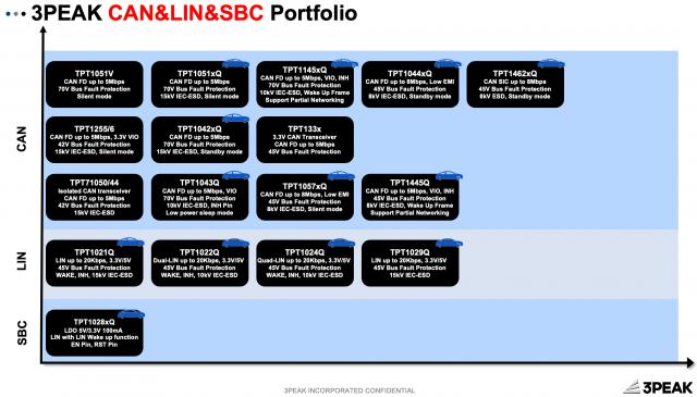 思瑞浦浦半导体供应商专注于高性能模拟芯片和嵌入式处理器。 作为我国模拟接口芯片的领导者,3PEAK(股票号:688536)可以提供全系列一站式车载网络。 CAN 收发器、LIN 收发器,系统基础芯片(System Basis Chip, SBC)解决方案,性能优异,已达到行业领先水平。