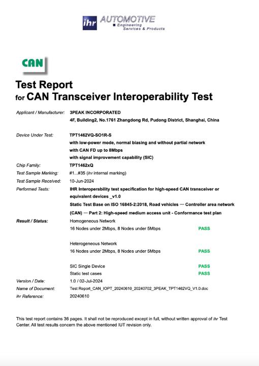 整个思瑞浦系列 LIN 所有收发器都通过了第三方权威实验室 IHR 益驰 ISO 17987-7 一致性测试和国际标准报告;益驰是全球权威汽车总线一致性测试和权威认证之一。它是一个国际标准化组织 ISO Work Group 成员,是 LIN 联盟、联盟等通用总线标准和 GMLAN 等待整车厂标准的相关检测服务商。