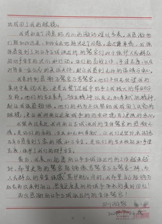 唐女士写了一封亲笔感谢信。