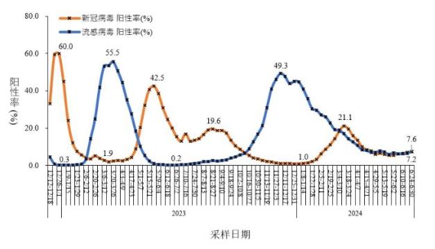 新冠病毒检出率从第23周(6月3日至6月9日)的6.2%小幅上升到第26周(6月24日至6月30日)的7.2%。