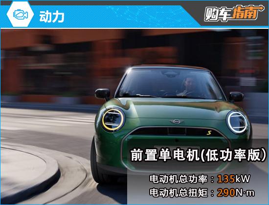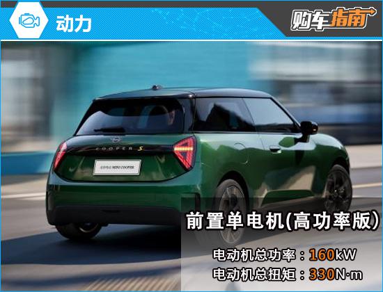动力装置方面,电动 MINI COOPER 整个系统配备了外置单电机,分为高级。 / 低功率版本,低功率版本, E 版型电机总功率 总扭距135kW 290N · m,CLTC 纯电续航里程为 456km;大功率 SE 电动机总功率版本 总扭距160kW 330N · m,CLTC 纯电续航里程为 452km。