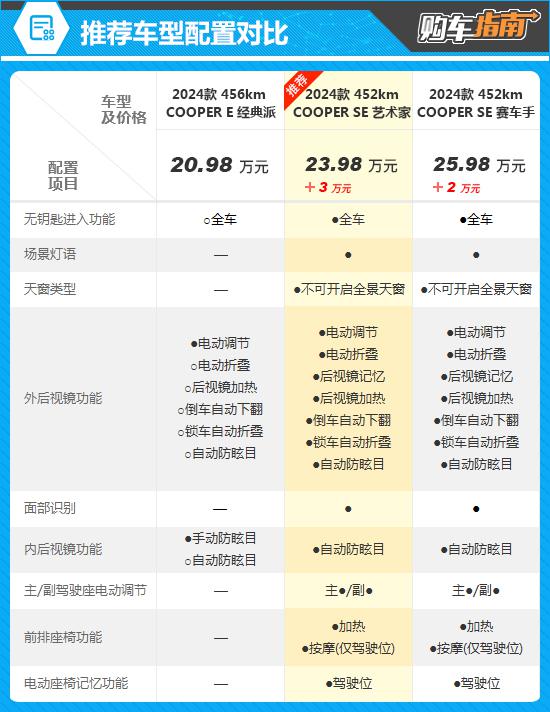 总体来看,2024 款电动 MINI COOPER 452km COOPER SE 艺人更值得推荐,买车时可以优先选择。