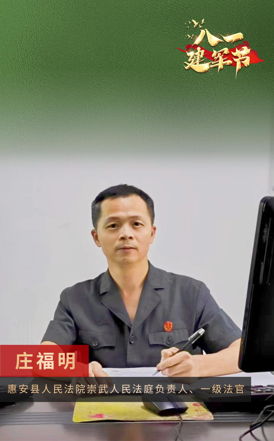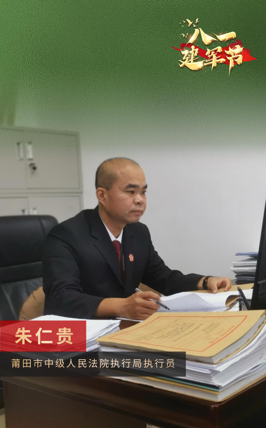 退休后,我有幸通过了公务员录用考试,成为了一名法院人。20多年来,我一直服务于审判第一线,始终弘扬“吃苦、奉献、牺牲”的军事精神,努力练习审判业务的综合技能,践行司法为民的宗旨。同时,我努力成为惠安法院的“老兵调解员”,致力于为军人家属提供专业的法律援助,不断为军队支持的司法服务尽自己最大的努力。