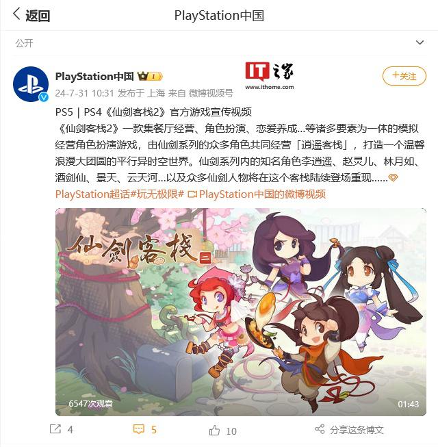 IT 世家 8 月 1 日消息,@PlayStation 中国 昨天发布微博,宣布“仙剑客栈” 游戏正式进行 PlayStation 5、PlayStation 4 平台发行,并且发布了官方游戏宣传视频。