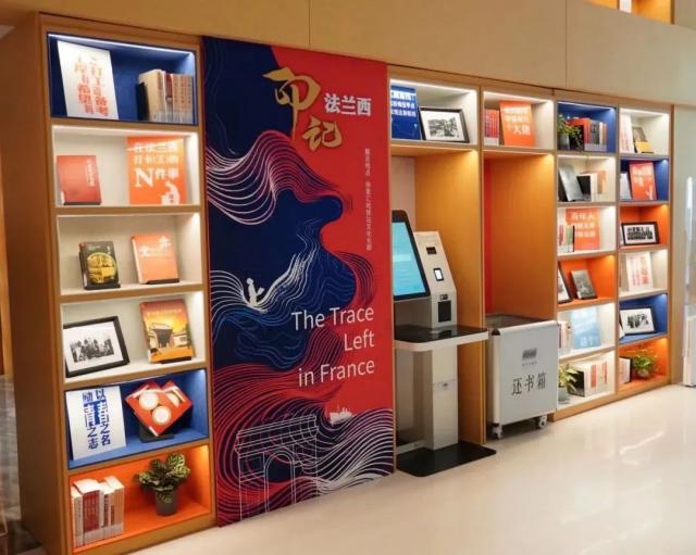 一楼的书柜,主题内容也会时不时更新。目前正在展出“印记” · 以法兰西为主题的展览,展示了丰富的书籍和资料,带您回顾百年前青年学生留法学习的历史。