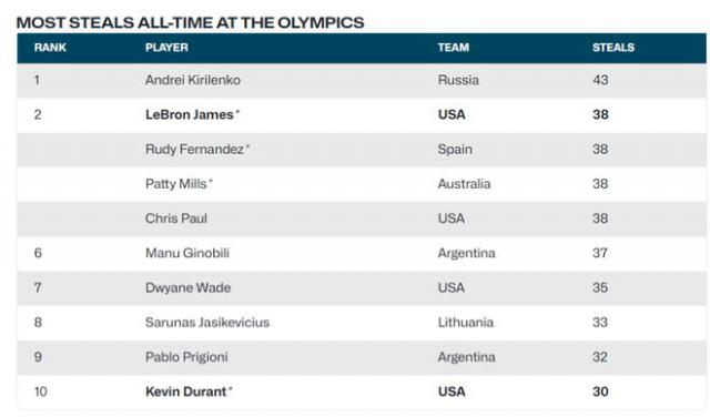 这次杜兰特完成了 3 第二次抢断,奥运会断球总数达到 28 第二,超越阿根廷坎帕佐、西班牙卢比奥和法国德科洛,达到历史第一。 10。