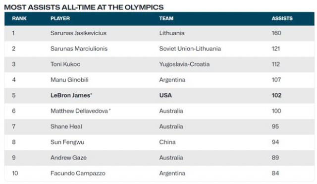 3. 在奥运助攻榜上,詹姆斯排名第一。 5