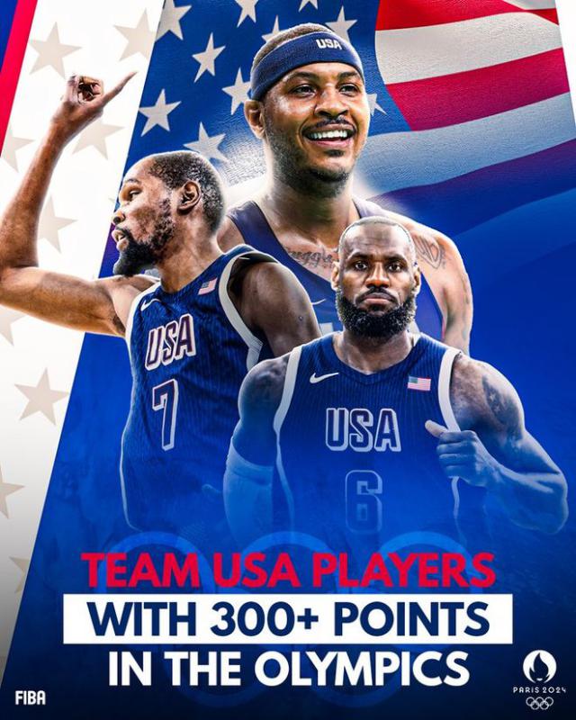 算上这场比赛 12 分数,詹姆斯的奥运总得分达到 306 得分。在美国男篮历史上,只有杜兰特和安东尼的奥运会得分超过了之前。 300 分数。在采访中,詹姆斯曾经说过,这是他最后一届奥运会,他的最终总分会达到什么高度?