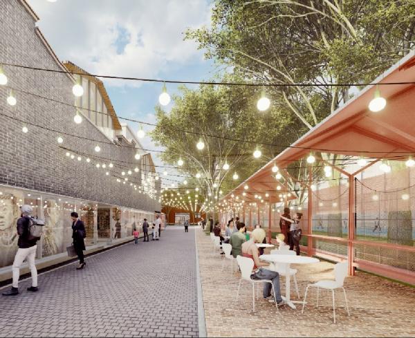 作为美院区未来产业激活的载体,地兴里街坊包括新建和改造两个部分。在这些产业中,新建部分地兴里拆迁地块,建设符合美院和区域发展定位的艺术产业,规划配备 187 一个机动车泊位,缓解区域停车问题。改造区结合美院北区宿舍进行优化,引入展览、新零售、艺术体验业态,形成创意街区 地兴里工业街坊,主要是美术学院艺术培训中心。