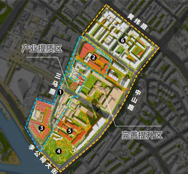 依托三路沿线美院教室和低效媒体,主要形成两组建筑空间。通过三路沿线封闭院墙,重点依托美院教室和大师工作室进行优化和开放。沿着三条路开放,形成百年美学空间,进入开放后的多个入口。盘活区内闲置公司用房,放入艺术展厅等业态,与企业前院形成组合展示空间;加强美术学院石膏馆的优质资源,开放形成微博博物馆,形成校内外空间纽带。