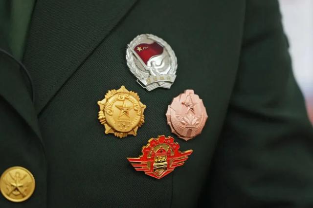 她骄傲地指向胸前 4 枚勋章分别是:边境边防斗争纪念章、三级卫国守边纪念章、卫国守边三级勋表、重大军事非战争行动荣誉勋表。