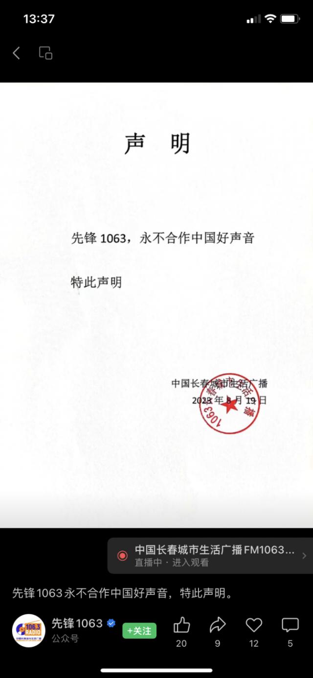 记者注意到,认证信息为长春城市生活广播微信微信官方账号“先锋” 1063 ",在他的视频号上发表了一份声明,上面盖着红色公章:"先锋 十六三,永远不要与中国好歌合作。在此声明。”声明署名为中国长春城市生活广播,8 月 19 日。