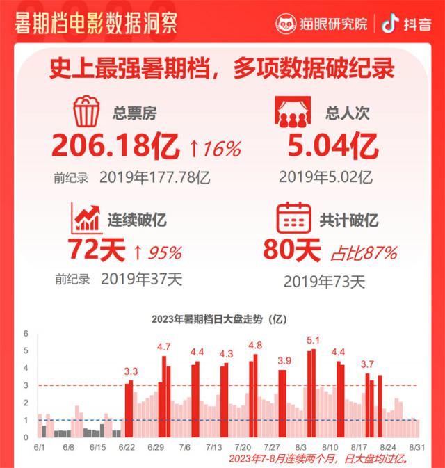 步入 9 月,2023 年度电影暑期档正式结束,今年夏天,电影市场最终以总票房累计结束。 206.18 观影人数超过1亿元 5.04 亿元的结束,刷新了中国电影暑期档票房、观影人数的记录。9 月 1 日,猫眼研究院联合抖音发布了《2023》 暑期档电影数据洞察报告(以下简称《报告》)。