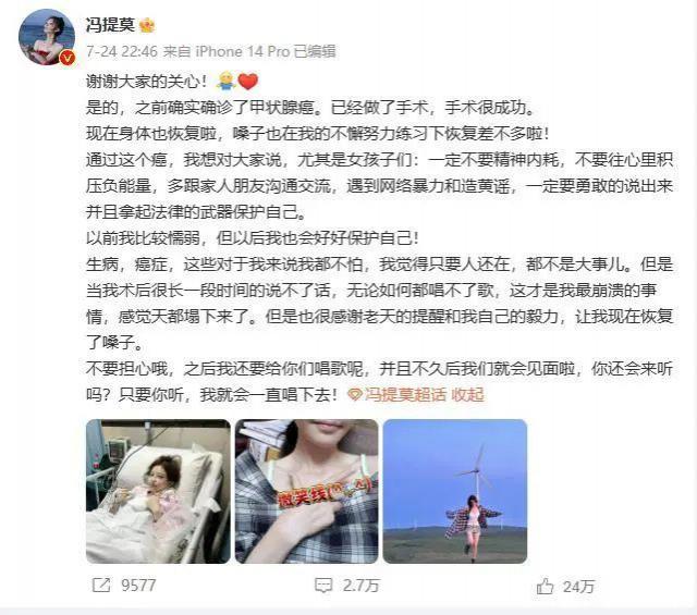 前不久,歌手冯提莫在微博上发消息称自己患有甲状腺癌,手术后已经恢复。她说,通过这种癌症,她想告诉大家,尤其是女生,一定不要精神内耗,不要在心里积累负能量。