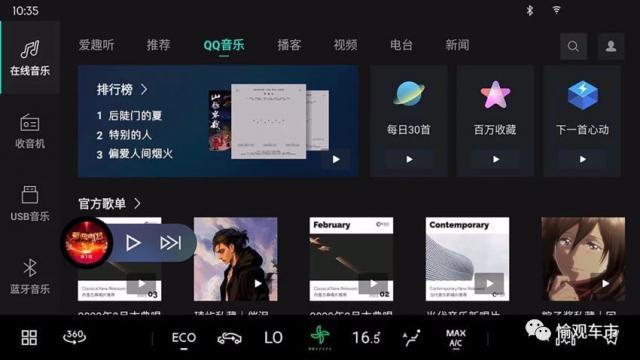 搭载 820A 与 E03 芯片更新后,开机速度和开机速度将显著提高 APP 打开速度,提高整体界面和图标设计,同时实现 Dock 栏定制功能;将导航升级到高德地图 610 版本提升了“导航信息、手机互联功能、路线偏好扩展、足迹地图”四大领域的体验;音频播放软件全新更换了“腾讯爱听”。含有 QQ 丰富的音频资源,如音乐、微信阅读、喜马拉雅等。