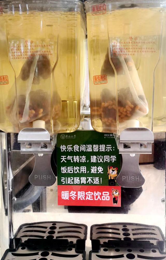 学校梅园食堂一楼还将夏季酸梅汤改为冬季特饮“红枣枸杞茶”,免费为师生提供。