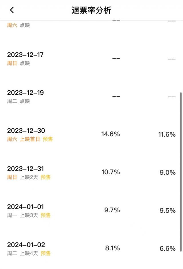 但是最近,这部电影超高的退票率引起了观众的热议,灯塔专业版数据显示,12 月 30 日本电影上映第一天,退票率高达 在接下来的三天里,14.6%的退票率也分别是 10.7%、9.7%、8.1%。