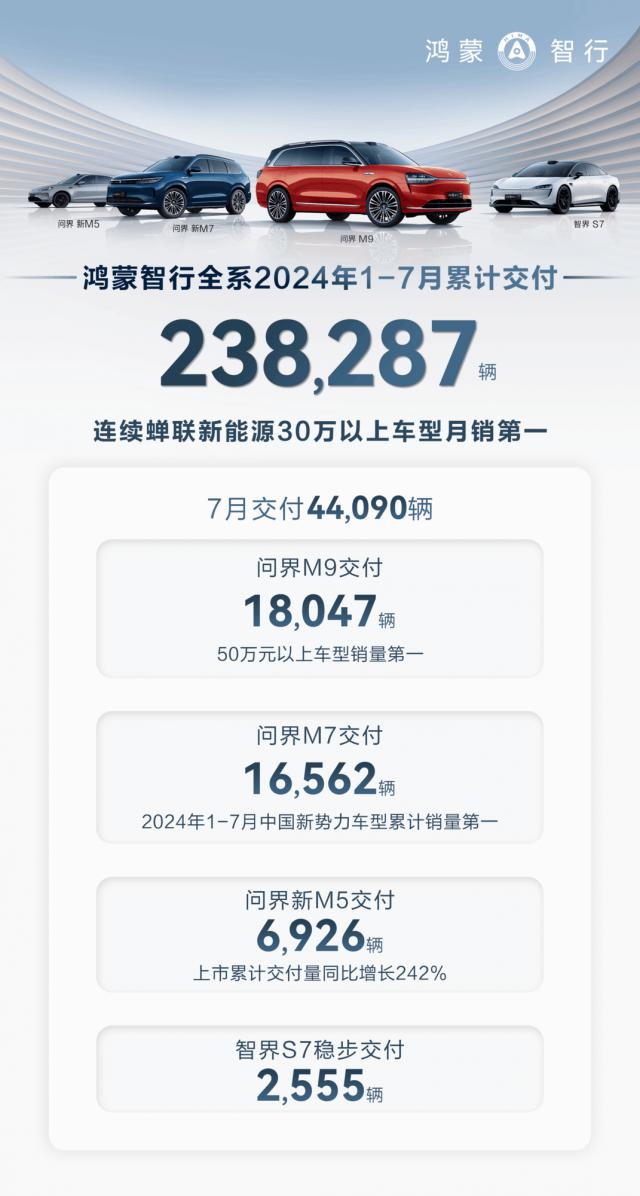 日前,各大汽车品牌相继公布。 7 月销。鸿蒙智行 7 月交付新车 44090 辆,1-7 每月累计交付新车 238287 车辆,稳居中国新力量品牌头部阵营。其中,鸿蒙智行旗下 AITO 问界品牌技术旗舰 SUV 问界 M9 在 7 月交付新车 18047 车辆,累计交付超过 7 一万辆,不断刷新豪华车销售记录;国民 SUV 问界新 M7 系列 7 月交付新车 16562 车辆,累计交付突破 20 万,成为销售奇迹。