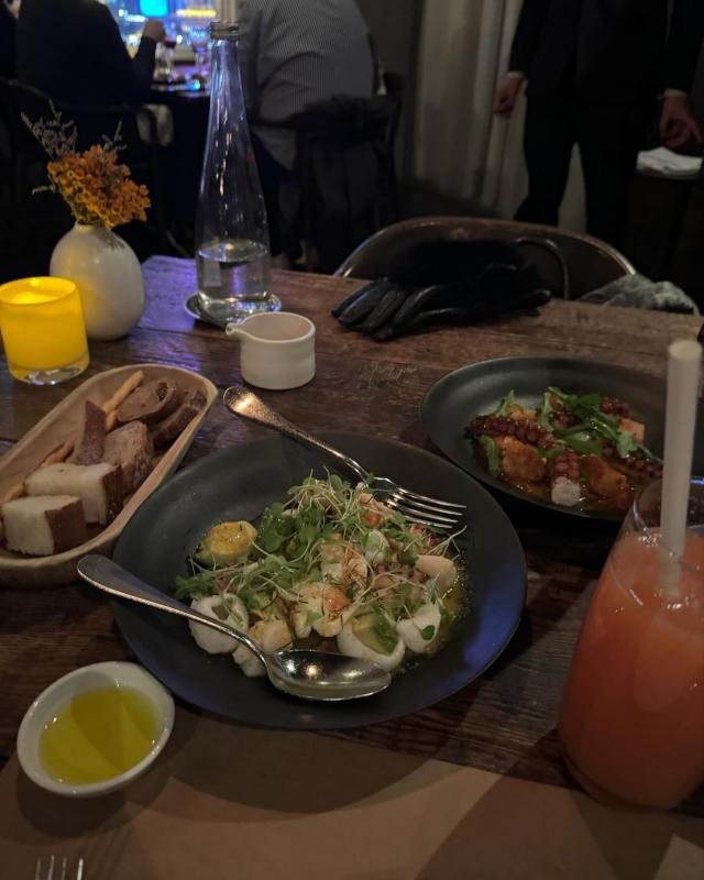 美丽的风景自然离不开美味的食物。王诗龄分享的菜肴看起来很普通,价格应该很高。王诗龄对面的桌子上有一副男士手套,椅子上有一条男士围巾。很有可能是他的父亲王岳伦。