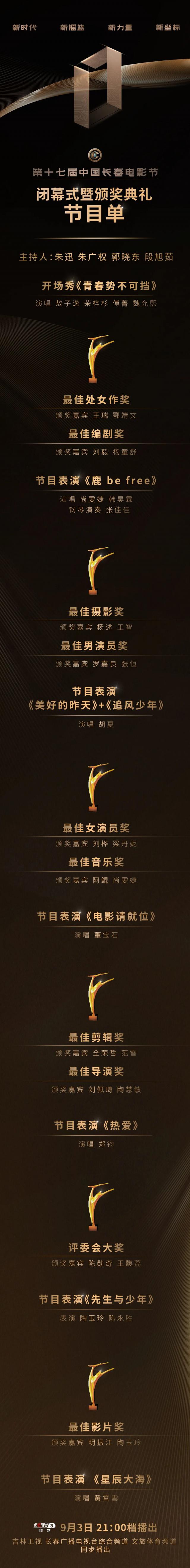 金鹿三十而熠,共赴光影之约。第十七届中国长春电影节闭幕式暨颁奖典礼将在 9 月 3 日 21 点,中央广播电视总台综艺频道(CCTV-三是播出,这场色彩斑斓的电影盛典也将画下圆满的句号。