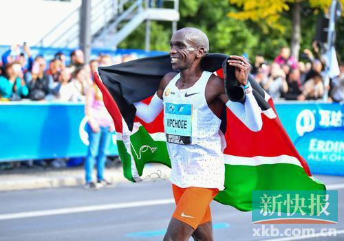 ■ 9 月 25 那天,基普乔格在夺冠后庆祝。新华社发布