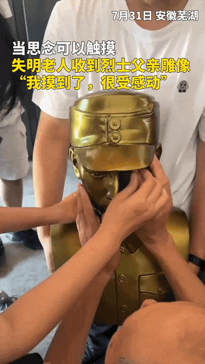 7月31日,安徽芜湖。失明的老人在思念和触摸的时候,收到了烈士爸爸的雕像,“我触摸到了,深受感动”。1947年9月,朱代元的父亲朱世仓在解放战争中不幸牺牲,当时朱元代还没有出生。这座雕像是由叶庆华女性捐赠的,她是烈士孟祥斌遗邈“为烈士画像”公益活动的发起者。