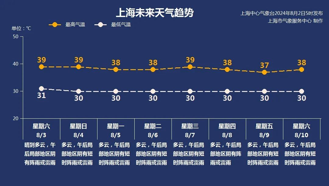 周末,上海将天气炎热,最高气温在40℃左右。下周末,副热带高压略有减弱,局部雷暴的概率增加,但温度仍然很高,极端最高气温仍为39℃,不能放松防暑降温。