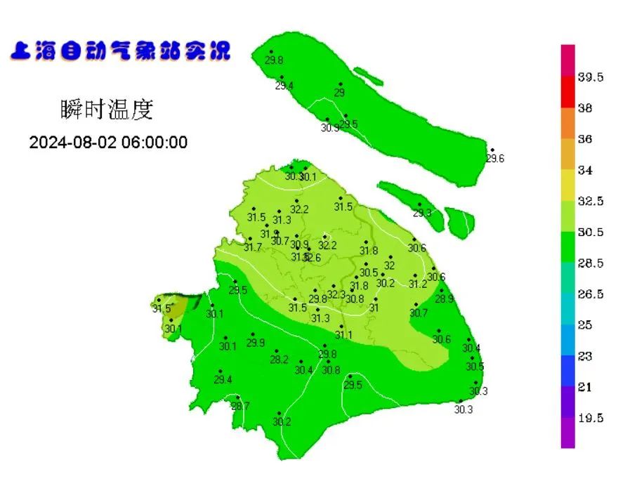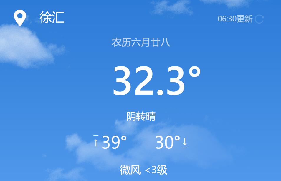 今日(8月2日)上海晴至多云,热气持续高温攻击!6时,全市气温基本在29~32℃之间,市区徐家汇站32.3℃,预计今日最高气温也将达到40℃。由于能量积累,下午可能会有短时阵雨或雷雨,范围小,时间短。