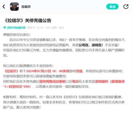 但是,7月22日,广州因陀罗旗下的两款游戏《环形战争》和《拉结尔》在游戏社区TapTap官方账号上发布了“关停充值公告”,称公司在2022年年中资金短缺,未来坚持为玩家提供游戏运营服务,没有任何利润,但现在已经步履维艰,无法支撑服务器费用,公司不得不进入破产清算阶段。