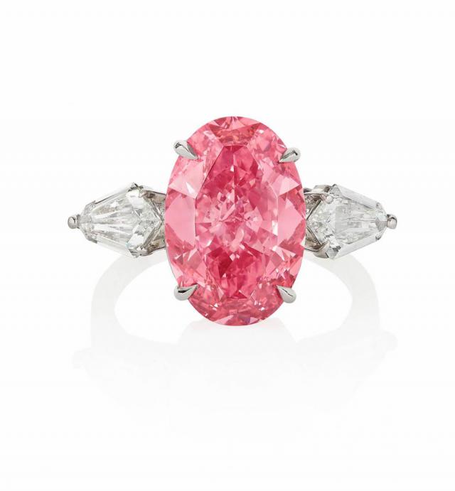 图为一枚 6.21 克拉色彩鲜艳的粉色钻戒, 1086 万瑞郎成交。 富艺斯供图