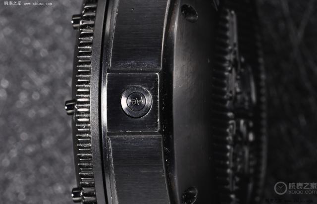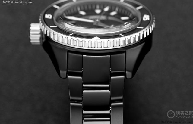 瓷器海归 FULL BLACK 使用黑色陶瓷外侧,为了更好地展示其深邃的质感,新产品将其转化为哑光效果。这种哑光瓷与表壳相似,使视觉感觉更好。不锈钢表壳哑光 PVD 涂层处理;表面手柄、旋紧后盖、表圈防滑齿纹为光面。 PVD 涂层,这是本作外观细节的亮点。