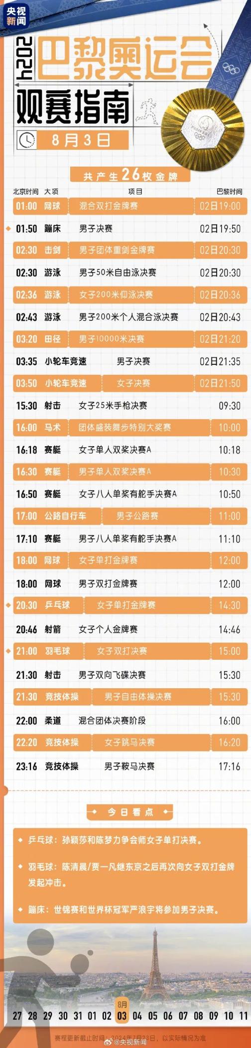 八月三日,巴黎奥运会观赛指南来了↓(来源:央视新闻客户端)