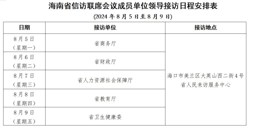 8月5日至8月9日,海南省信访局发布省直属单位领导接访行程安排。详情(来源:南海网)